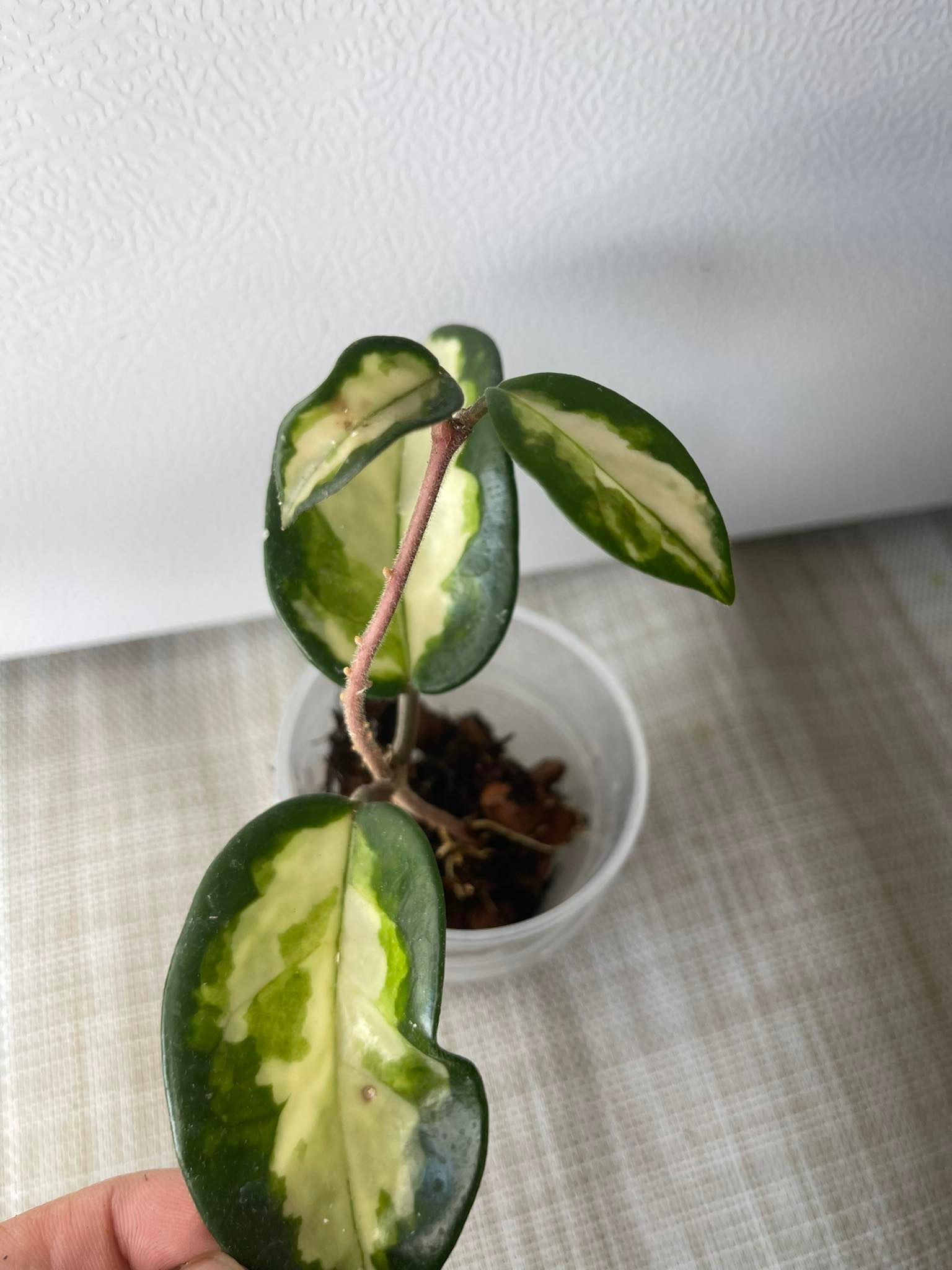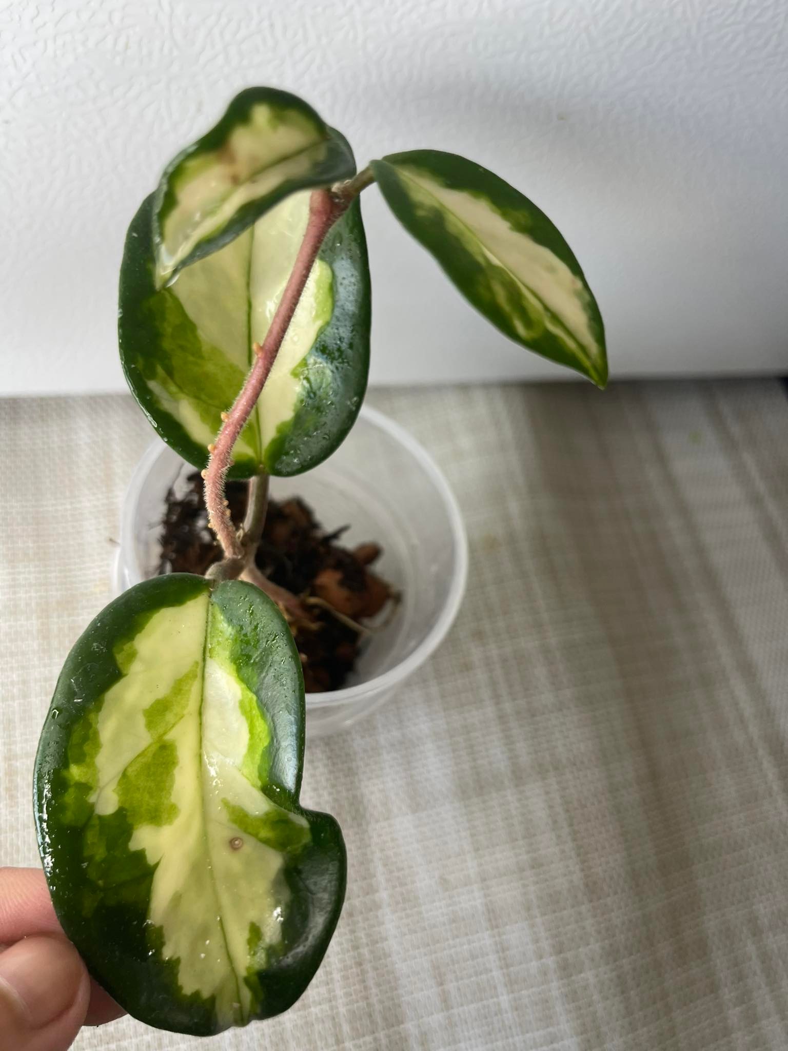 Bring some life into your home with this Hoya Krimson Princess. This rooted plant will spruce up any room with its vibrant colors. The Hoya Krimson Princess will be shipped with moist moss to keep it healthy and vibrant. With minimal care, this Hoya Krimson Princess will last you a long time.