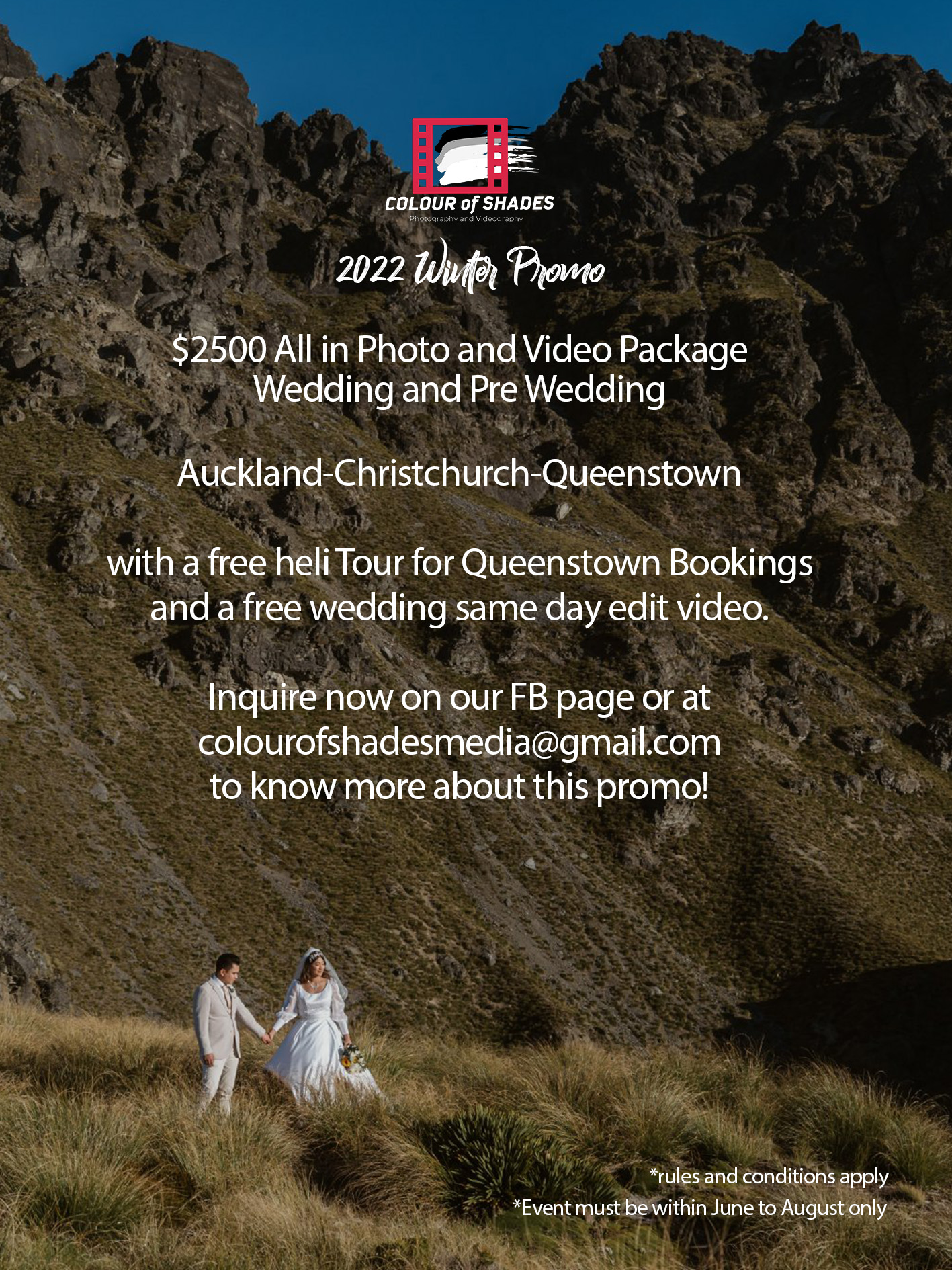 2022 Winter Promo. $2500 all in package for wedding and pre wedding bookings. A free 45min heli shoot is included on all bookings in Queenstown only. We will also include a same day edit video for all wedding bookings for Auckland and Christchurch only. The promo package includes; unlimited photos, 4-6min Highlights for Weddings/ 1-2min Save the date film for Pre Weddings.